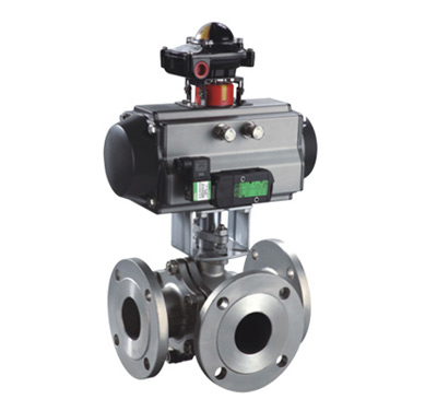 氣動三通球閥分L型和T型,介質流通方向見下圖。L型三通球閥適用于介質流向的切換,能使相互垂直的兩個通道連通:T型三通球閥適用于介質的分流、合流或流向切換,T型孔道可以使三個通道互相連通或使其中兩個通道連通,三通球閥一般采用兩個閥座結構,亦可根據用戶要求采用四閥座結構。